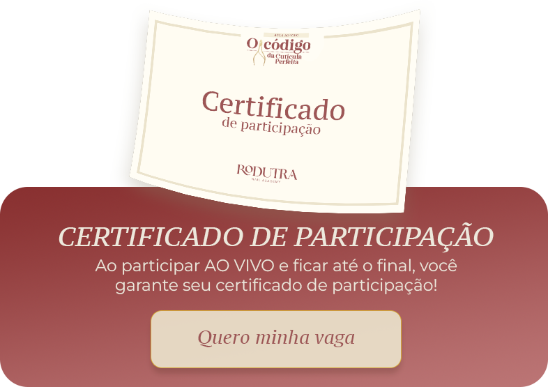 No final da aula, você vai entender o código por trás da cutícula perfeita — e nunca mais vai depender de tentativa e erro para ter um resultado bonito nas clientes.